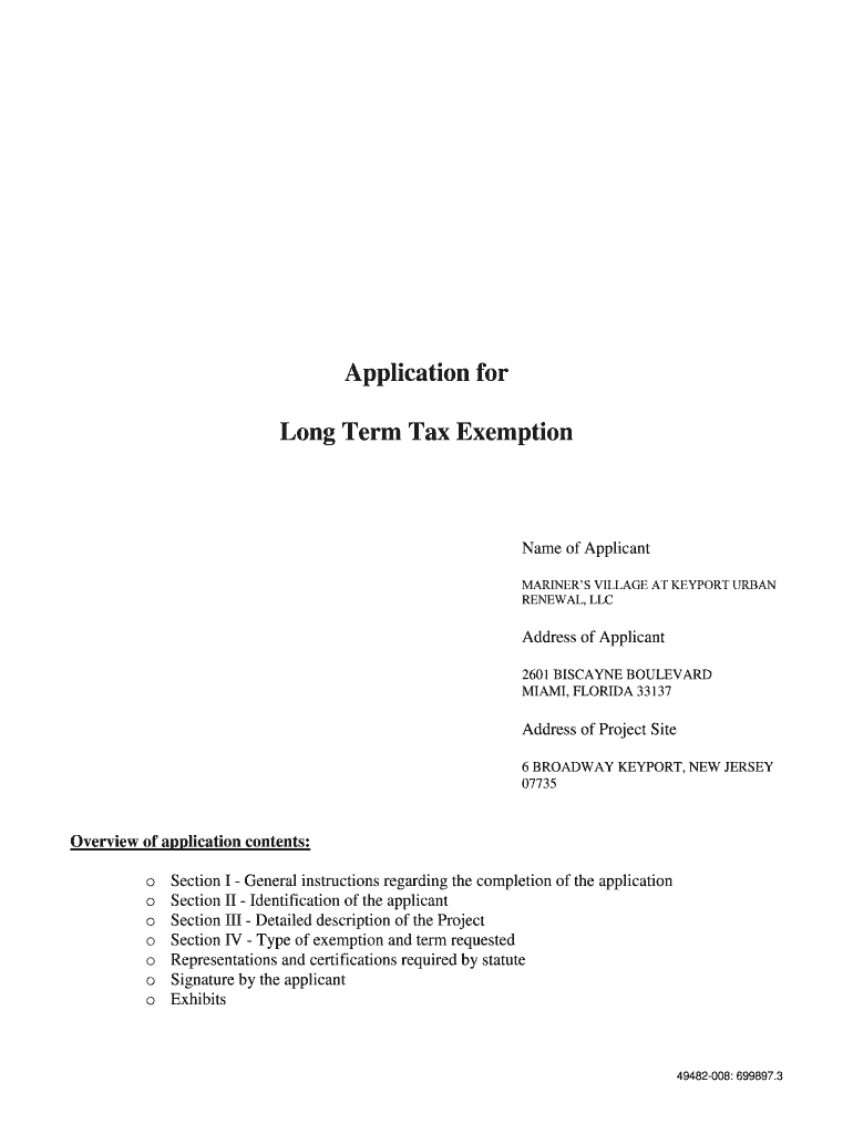 Application for Long Term Tax ExemptionName of Applicant MARINERS VILLAGE AT REPORT URBAN RENEWAL, Address of Applicant 2601 BISCAYNE BOULEVARD MIAMI, FLORIDA 33137Address of Project Site 6 BROADWAY