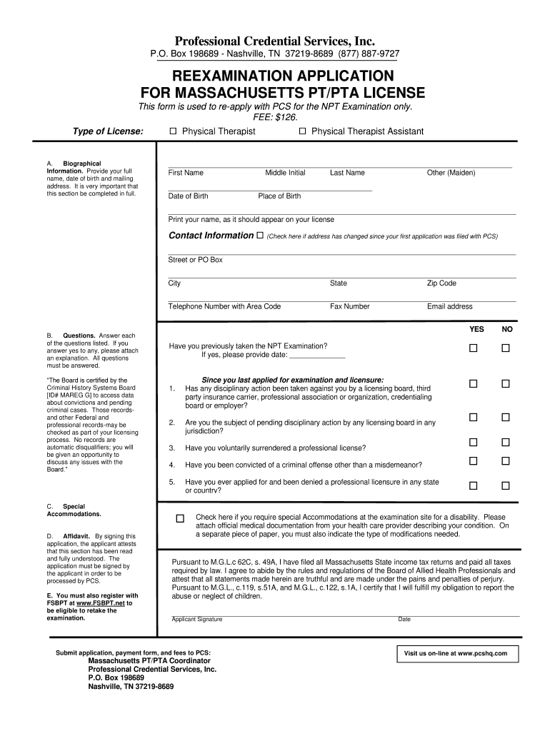 Professional Credential Services, Inc. P.O. Box 198689 Nashville, TN 372198689 (877) 8879727REEXAMINATION APPLICATION FOR MASSACHUSETTS PT/PTA LICENSE This form is used to reapply with PCS for the