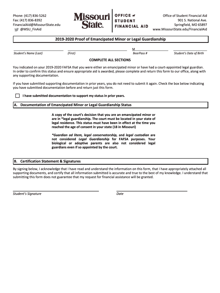 Phone:(417)8365262 Fax:(417)8368392 Financial MissouriState.edu MSU Final OfficeofStudentFinancialAid 901S. National Ave. Springfield,MO65897 www.MissouriState.edu/FinancialAid 20192020ProofofEmancipatedMinororLegalGuardianship