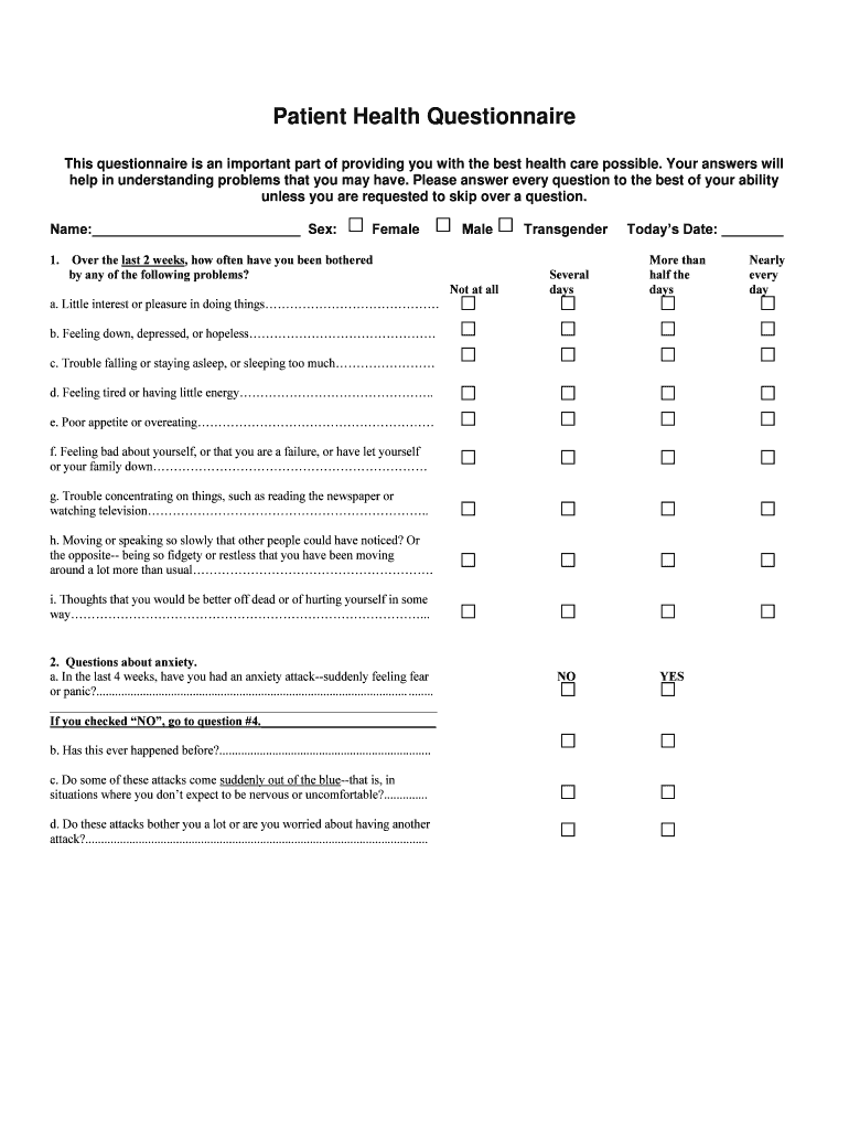 Patient Health Questionnaire This questionnaire is an important part of providing you with the best health care possible. Your answers will help in understanding problems that you may have. Please