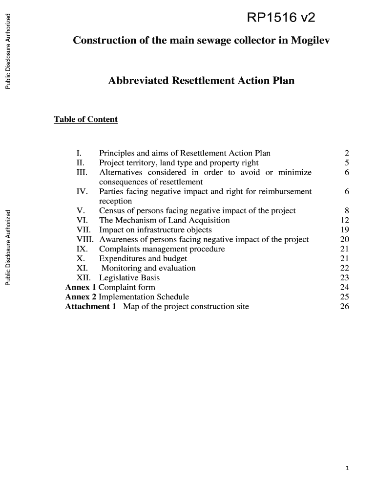 Public Disclosure AuthorizedConstruction of the main sewage collector in MogilevAbbreviated Resettlement Action PlanTable of Content.