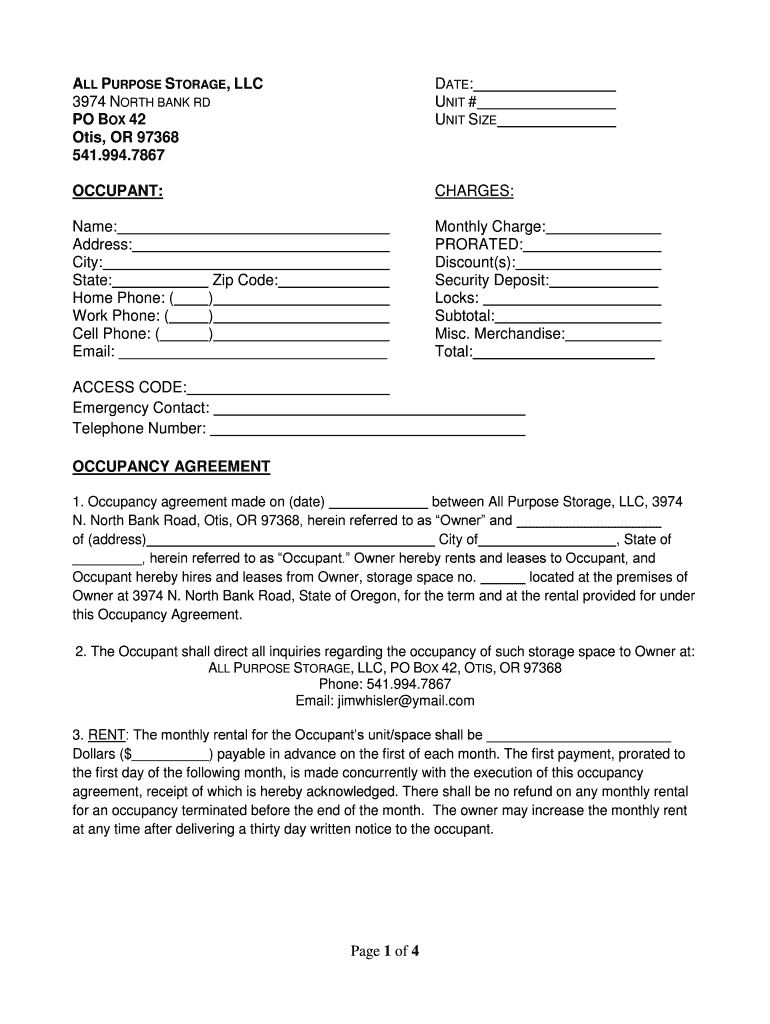 ALL PURPOSE STORAGE, LLC 3974 NORTH BANK RD PO BOX 42 Otis, OR 97368 541.994.7867DATE: UNIT # UNIT SIZEOCCUPANT:CHARGES:Name: Address: City: State: Zip Code: Home Phone: () Work Phone: () Cell Phone: