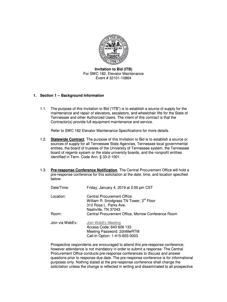 Invitation to Bid (ITB) For SIC 182, Elevator Maintenance Event # 32101108641. Section 1 Background Information1.1. The purpose of this Invitation to Bid (ITB) is to establish a source of supply for