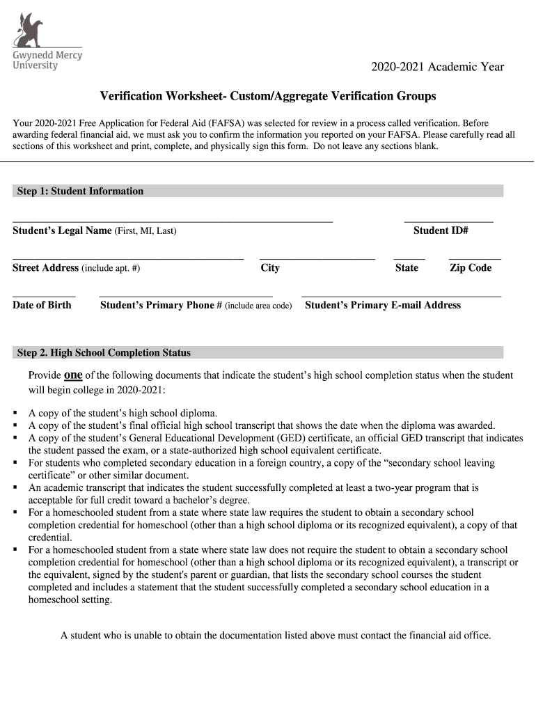 20202021 Academic Year Verification Worksheet Custom/Aggregate Verification Groups Your 20202021 Free Application for Federal Aid (FAFSA) was selected for review in a process called verification.