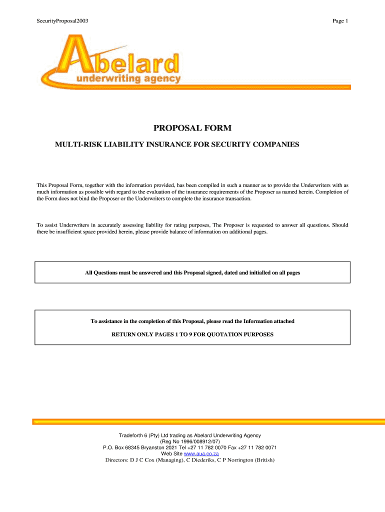 MULTITASK LIABILITY INSURANCE FOR SECURITY COMPANIESThis Proposal Form, together with the information provided, has been compiled in such a manner as to provide