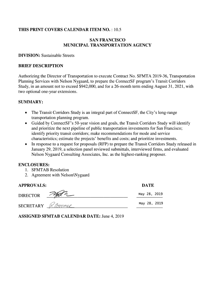 THIS PRINT COVERS CALENDAR ITEM NO. 10.5 SAN FRANCISCO MUNICIPAL TRANSPORTATION AGENCY DIVISION: Sustainable Streets BRIEF DESCRIPTION Authorizing the Director of Transportation to execute Contract