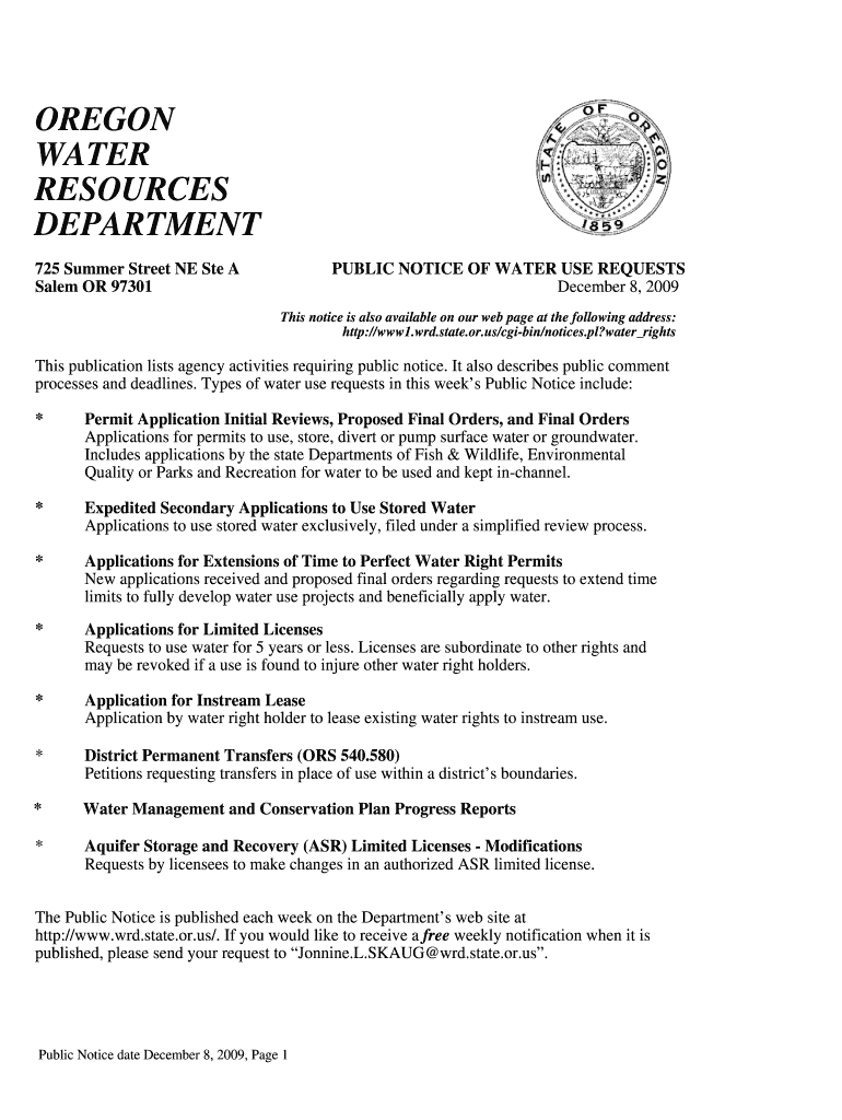 Salem OR 97301PUBLIC NOTICE OF WATER USE REQUESTS