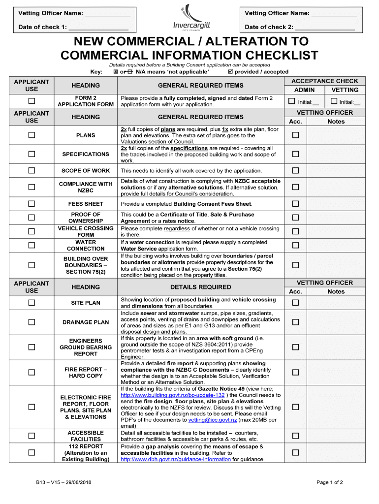 Vetting Officer Name: Vetting Officer Name: Date of check 1: Date of check 2: NEW COMMERCIAL / ALTERATION TO COMMERCIAL INFORMATION CHECKLIST Key:Details required before a Building Consent application