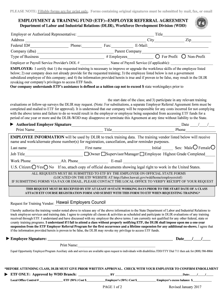 PLEASE NOTE: Fillable forms are for print only. Forms containing original signatures must be submitted by mail, fax, or emailEMPLOYMENT & TRAINING FUND (ETF)EMPLOYER REFERRAL AGREEMENT Department