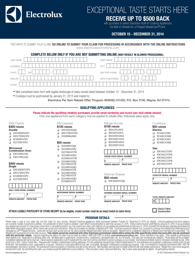 EXCEPTIONAL TASTE STARTS HERE RECEIVE UP TO $500 BACK with purchase of select Electrolux Builtin Cooking Appliances Via Mailing Rebate for a Prepaid MasterCardCard. OCTOBER 15 DECEMBER 31, 2014, TWO