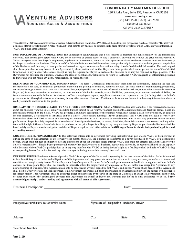 CONFIDENTIALITY AGREEMENT & PROFILE 180 S. Lake Ave., Suite 235, Pasadena, CA 91101 www.ventureibg.com (626) 4491550 (877) 5497870 Fax: (855) 7320050 Cal ARE LIC. # 01476657This AGREEMENT is entered