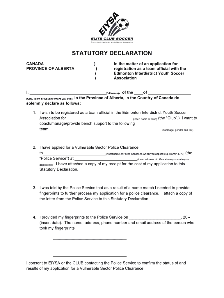 STATUTORY DECLARATION CANADA PROVINCE OF ALBERTA))))In the matter of an application for registration as a team official with the Edmonton Interdistrict Youth Soccer Association, (full name), of the
