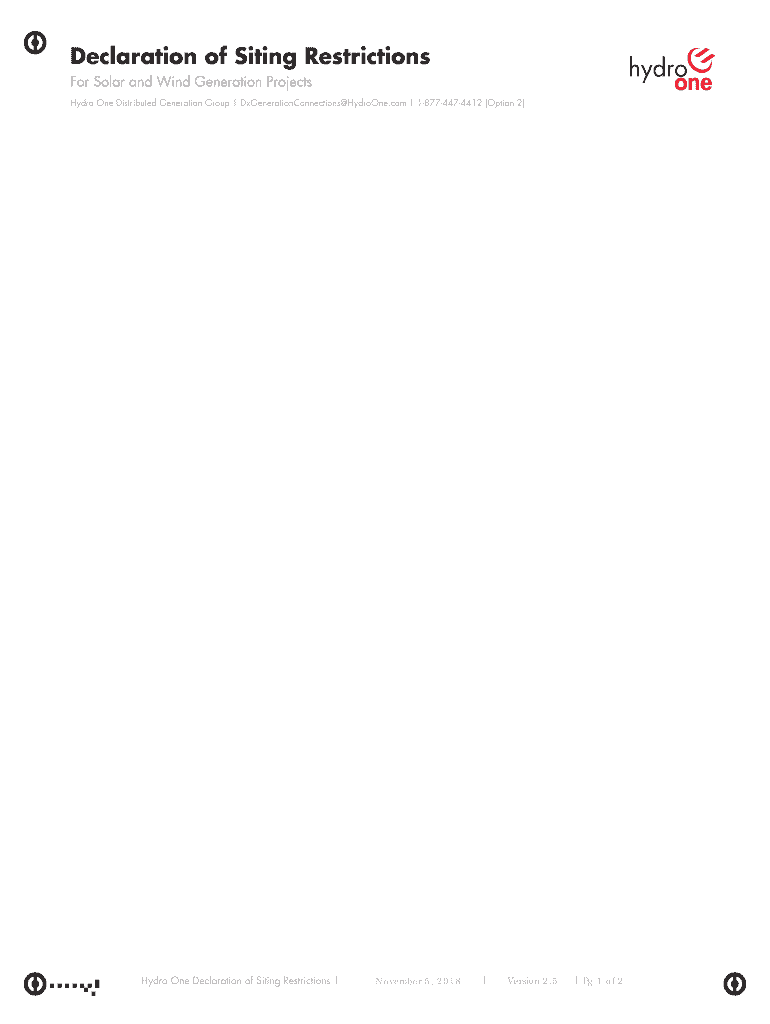 Declaration of Siting Restrictions For Solar and Wind Generation Projects Hydro One Distributed Generation Group DxGenerationConnections HydroOne.com 18774474412 (Option 2) ABOUT THIS DOCUMENT Any