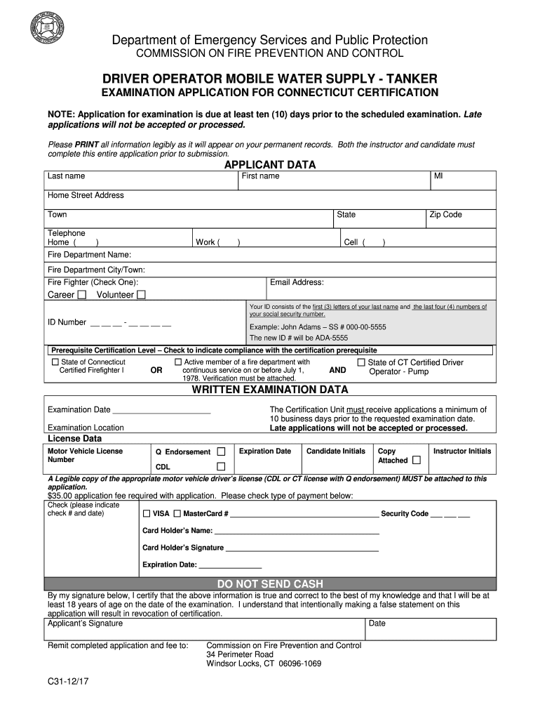 Department of Emergency Services and Public Protection COMMISSION ON FIRE PREVENTION AND CONTROLDRIVER OPERATOR MOBILE WATER SUPPLY TANKER EXAMINATION APPLICATION FOR CONNECTICUT CERTIFICATION NOTE: