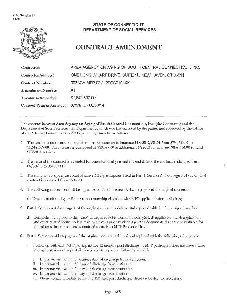 Contractor:AREA AGENCY ON AGING OF SOUTH CENTRAL CONNECTICUT, INC. Contractor Address:ONE LONG WHARF DRIVE,