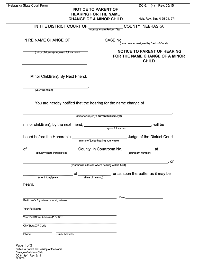 Nebraska State Court Formative TO PARENT OF HEARING FOR THE NAME CHANGE OF A MINOR CHILD DC 6:11(4)Rev. 05/15Neb. Rev. Stat. 2521, 271IN THE DISTRICT COURT OF COUNTY, NEBRASKA (county where Petition