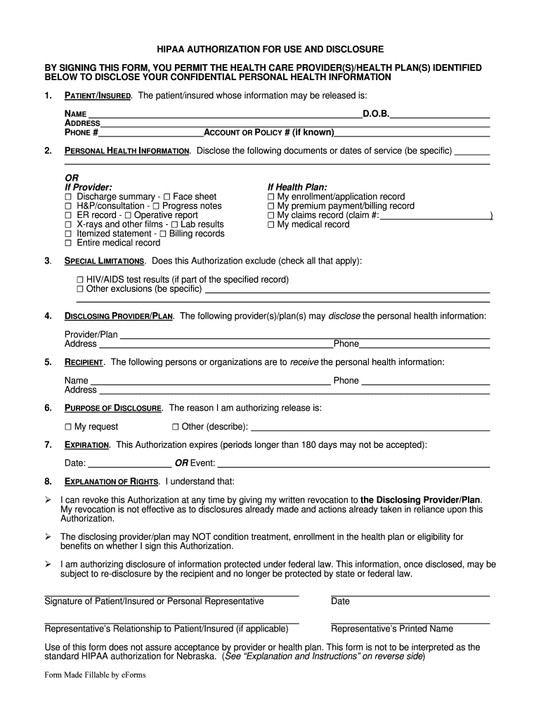 NE HIPAA Authorization for Use and Disclosure 2016-2026 free printable template