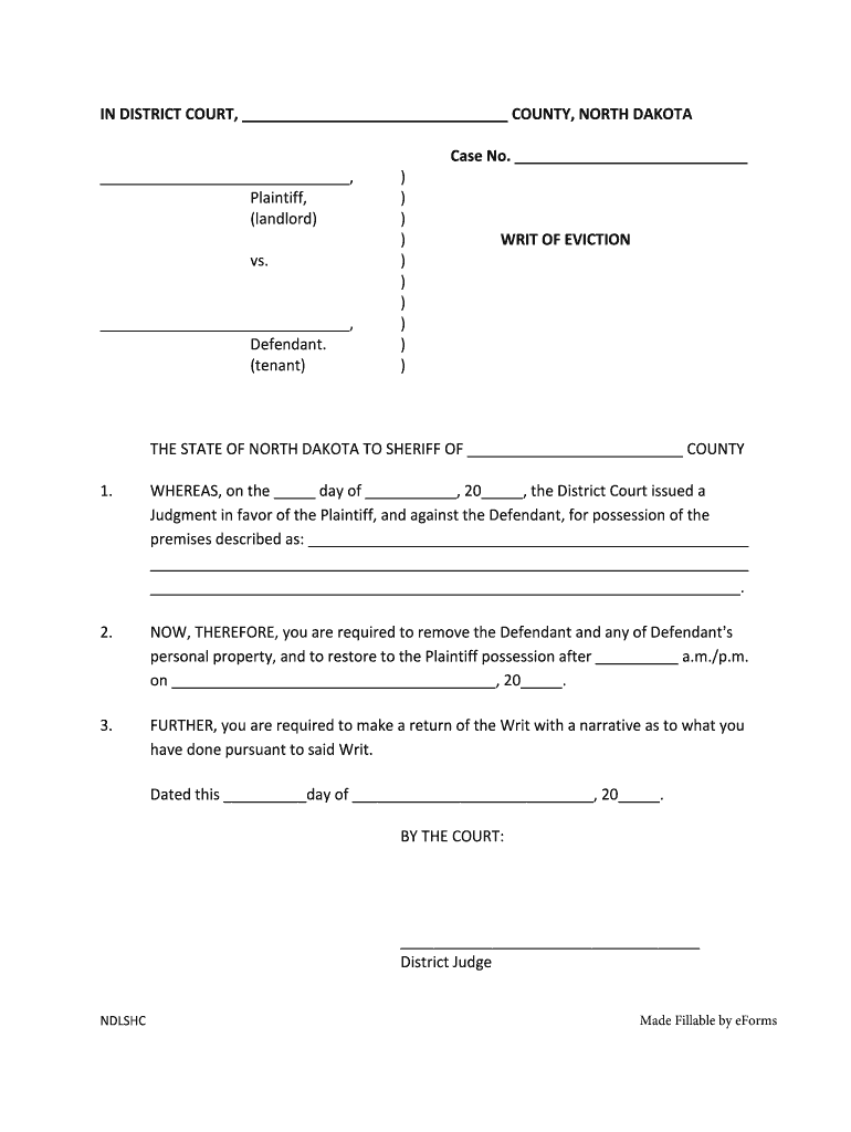 IN DISTRICT COURT, COUNTY, NORTH DAKOTA, Plaintiff, (landlord) vs., Defendant. (tenant)))))))))))Case No. WRIT OF EVICTION STATE OF NORTH DAKOTA TO SHERIFF OF COUNTY 1.WHEREAS, on the day of, 20,