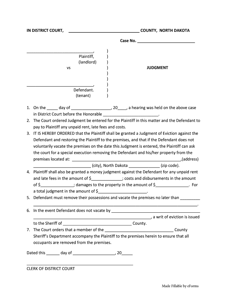 IN DISTRICT COURT, COUNTY, NORTH DAKOTA Case No. , Plaintiff, (landlord) vs, Defendant. (tenant))))))))))JUDGMENT1. On the day of, 20, a hearing was held on the above case in District Court before