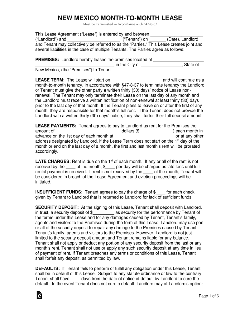 NEW MEXICO MONTHTOMONTH LEASE Must be Terminated in Accordance with 47837This Lease Agreement (Lease) is entered by and between (Landlord) and (Tenant) on (Date). Landlord and Tenant may collectively