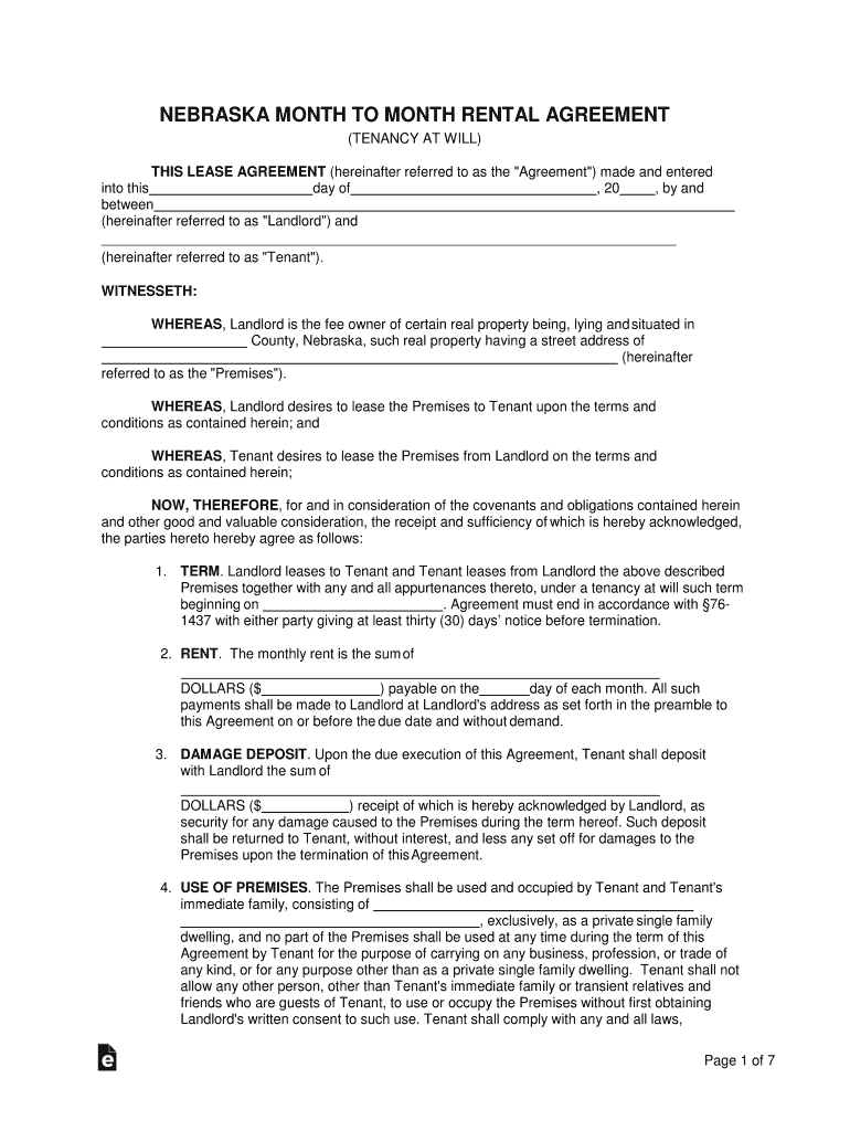 NEBRASKA MONTH TO MONTH RENTAL AGREEMENT (TENANCY AT WILL) THIS LEASE AGREEMENT (hereinafter referred to as the “Agreement “) made and entered into this day of, 20, by and between (hereinafter