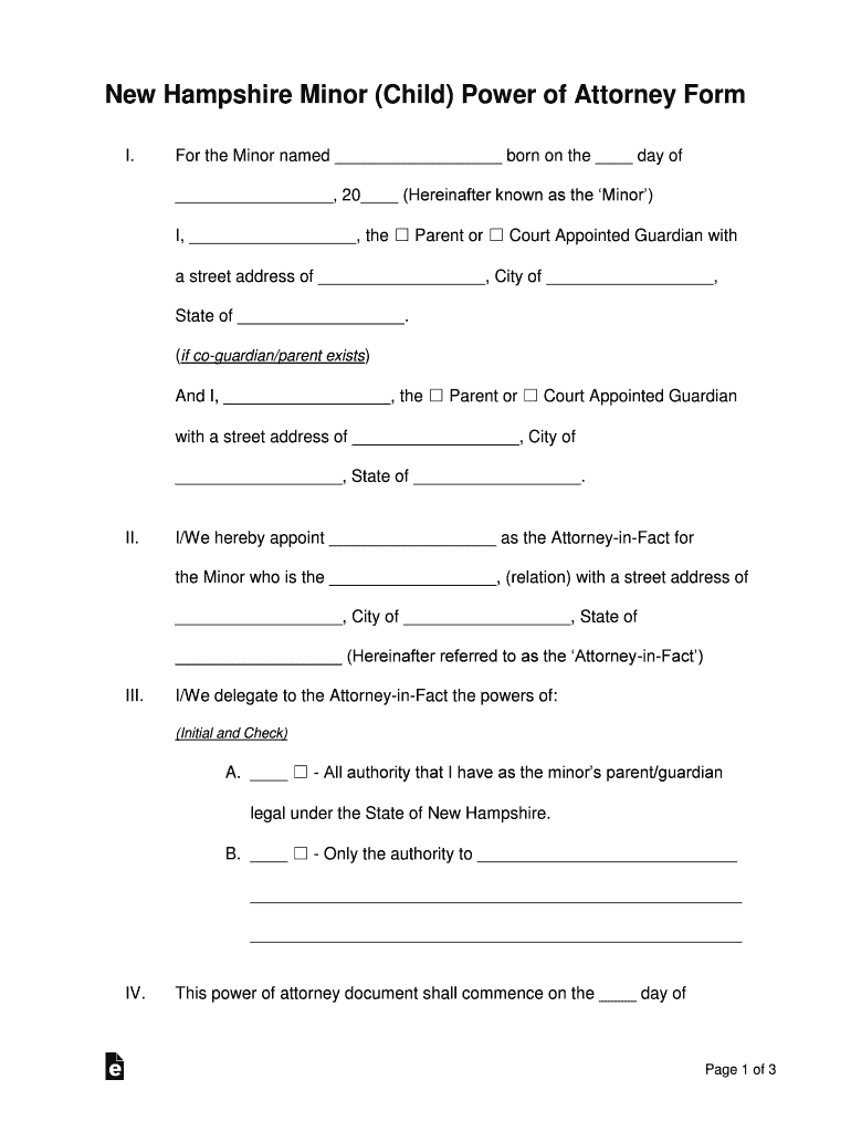 New Hampshire Minor (Child) Power of Attorney Form I. For the Minor named born on the day of, 20 (Hereinafter known as the Minor) I, the Parent or Court Appointed Guardian with a street address of,