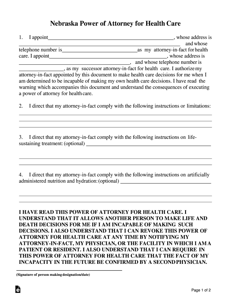 Nebraska Power of Attorney for Health Care