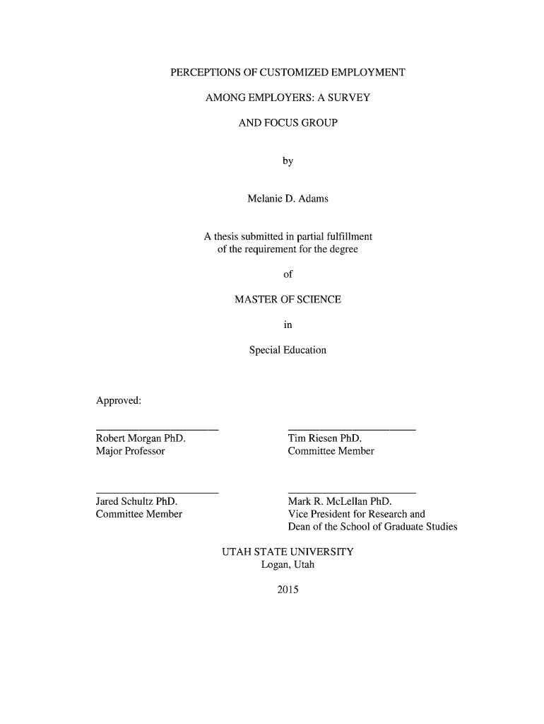 PERCEPTIONS OF CUSTOMIZED EMPLOYMENT AMONG EMPLOYERS: A SURVEY AND FOCUS GROUPbyMelanie D. Adams thesis submitted in partial fulfillment of the requirement for the degree of MASTER OF SCIENCE in Special
