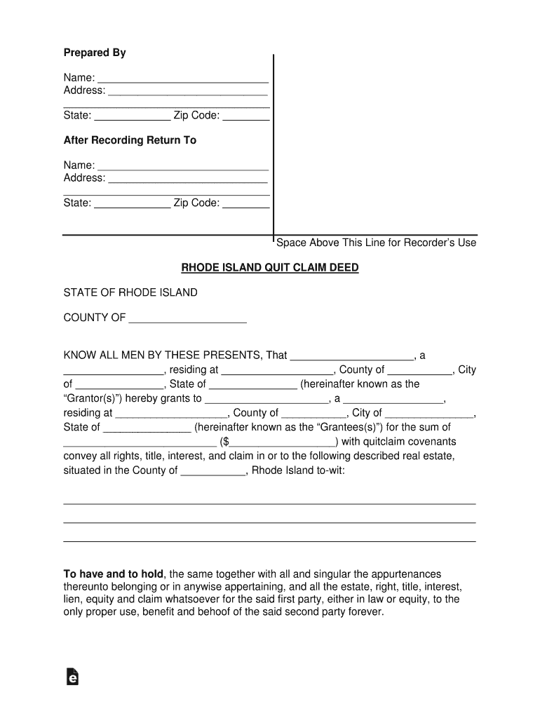 Prepared By Name: Address: State: Zip Code: After Recording Return To Name: Address: State: Zip Code: Space Above This Line for Recorders Use RHODE ISLAND QUIT CLAIM DEED STATE OF RHODE ISLAND COUNTY