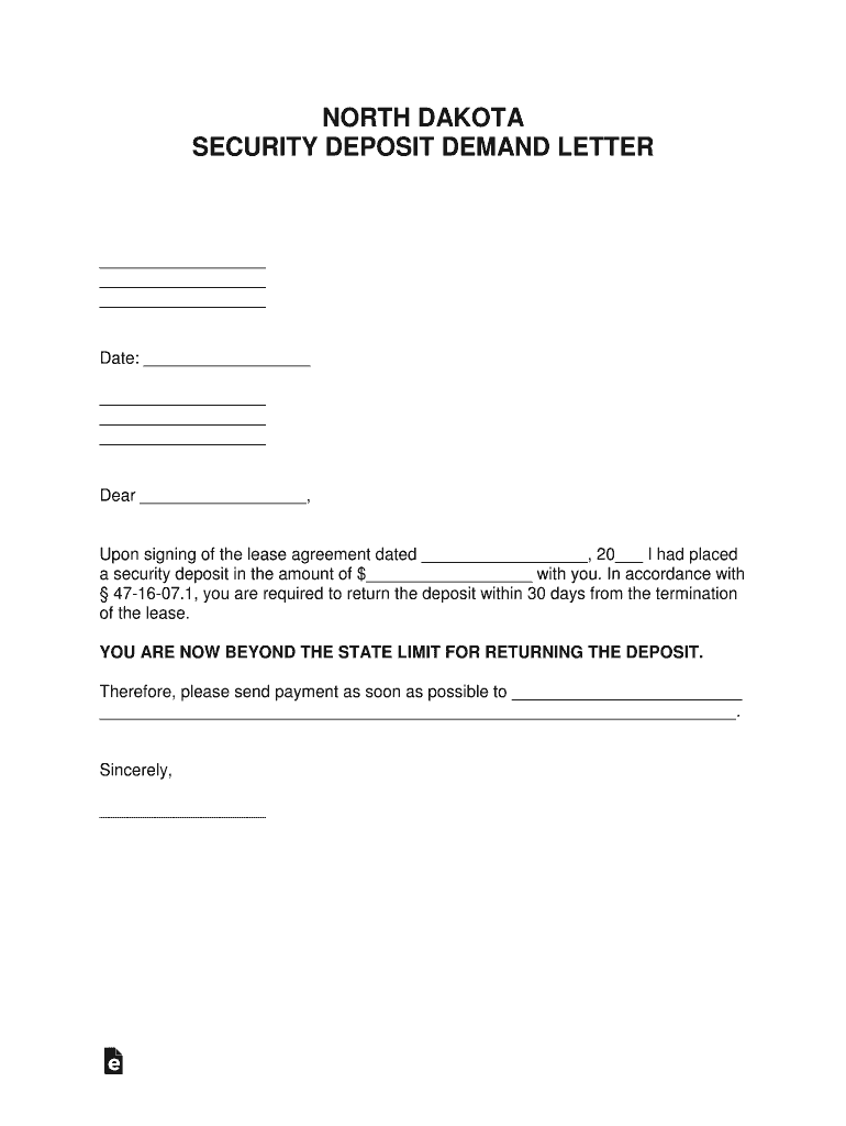 NORTH DAKOTA SECURITY DEPOSIT DEMAND LETTER Date: Dear, Upon signing of the lease agreement dated, 20 I had placed a security deposit in the amount of $ with you. In accordance with 471607.1, you