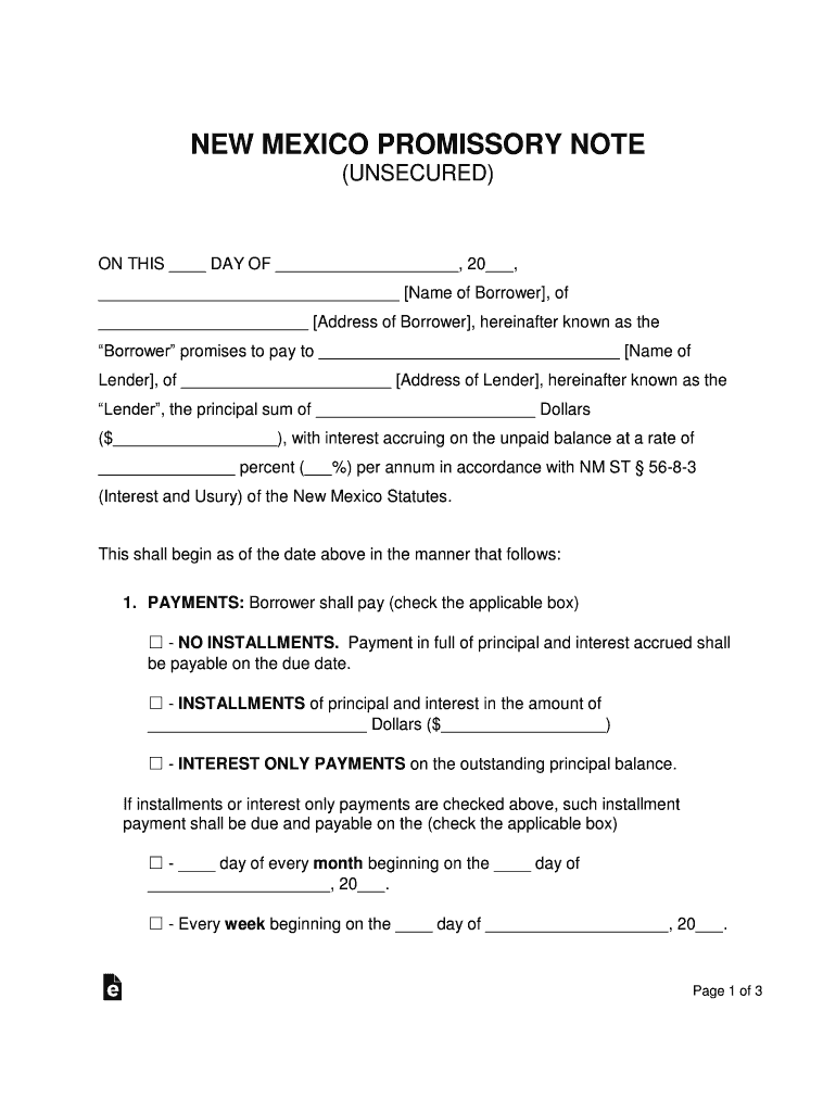NEW MEXICO PROMISSORY NOTE (UNSECURED)ON THIS DAY OF, 20, Name of Borrower, of Address of Borrower, hereinafter known as the Borrower promises to pay to Name of Lender, of Address of Lender, hereinafter