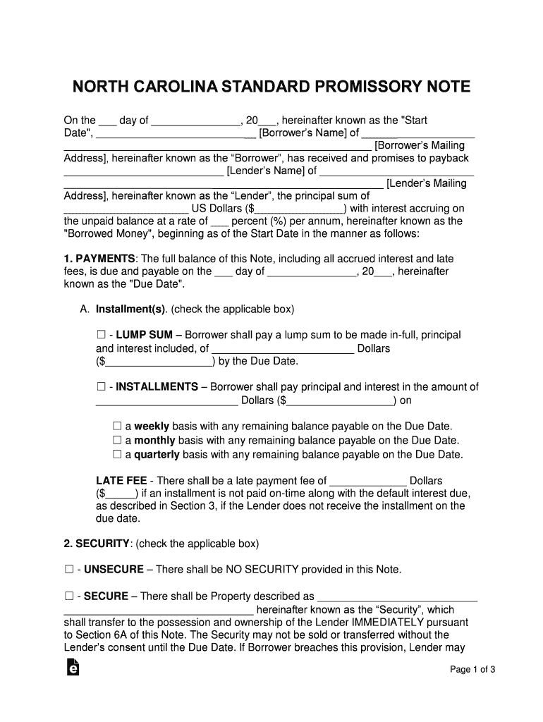 Individuals or entities entering into a loan agreement in the state of North Carolina are required to file a standard promissory note.