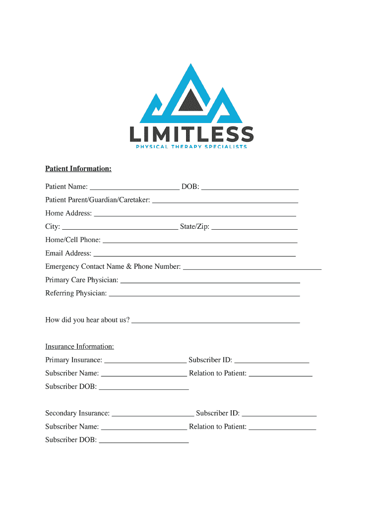Patient Information: Patient Name: DOB: Patient Parent/Guardian/Caretaker: Home Address: City: State/Zip: Home/Cell Phone: Email Address: Emergency Contact Name & Phone Number: Primary Care Physician: