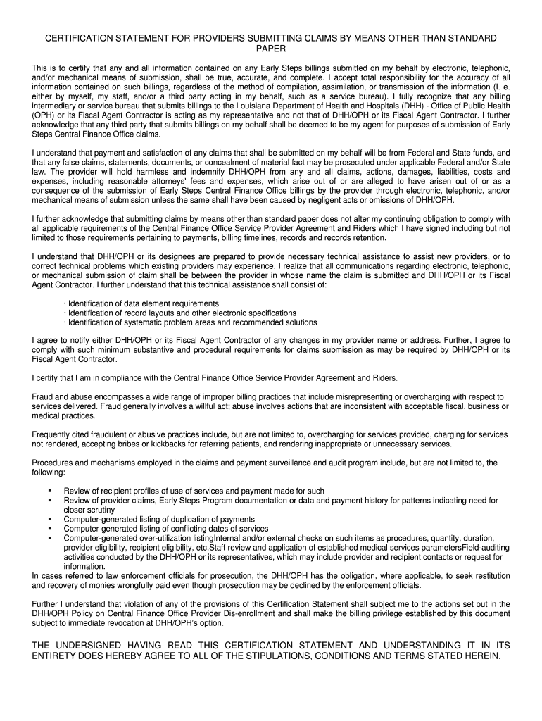CERTIFICATION STATEMENT FOR PROVIDERS SUBMITTING CLAIMS BY MEANS OTHER THAN STANDARD
