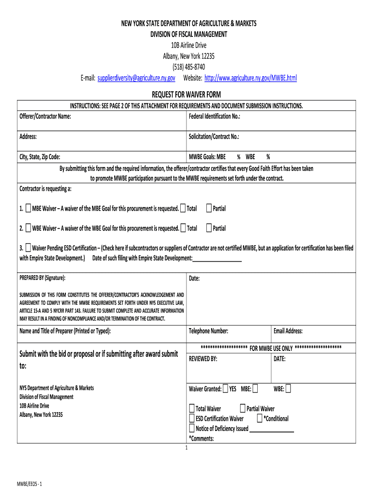 NEW YORK STATE DEPARTMENT OF AGRICULTURE & MARKETS DIVISION OF FISCAL MANAGEMENT 10B Airline Drive Albany, New York 12235 (518) 4858740 Email: supplier diversity agriculture.NY.gov Website: http://www.agriculture.ny.gov/MWBE.htmlREQUEST