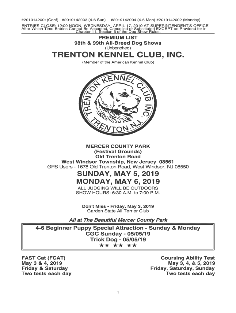 #2019142001(Cone) #2019142003 (46 Sun)#2019142004 (46 Mon) #2019142002 (Monday)ENTRIES CLOSE: 12:00 NOON, WEDNESDAY, APRIL 17, 2019, AT SUPERINTENDENT IS OFFICE After Which Time Entries Cannot Be