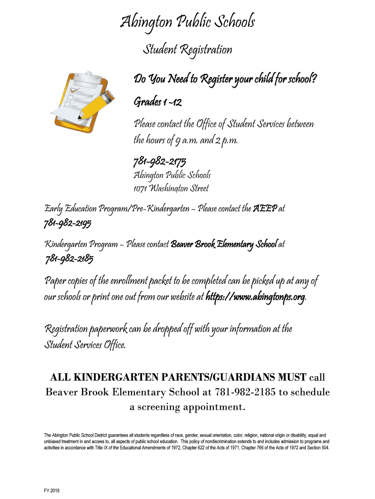 Abington Public Schools Student Registration Do You Need to Register your child for school? Grades 1 12 Please contact the Office of Student Services between the hours of 9 a.m. and 2 p.m. 7819822175