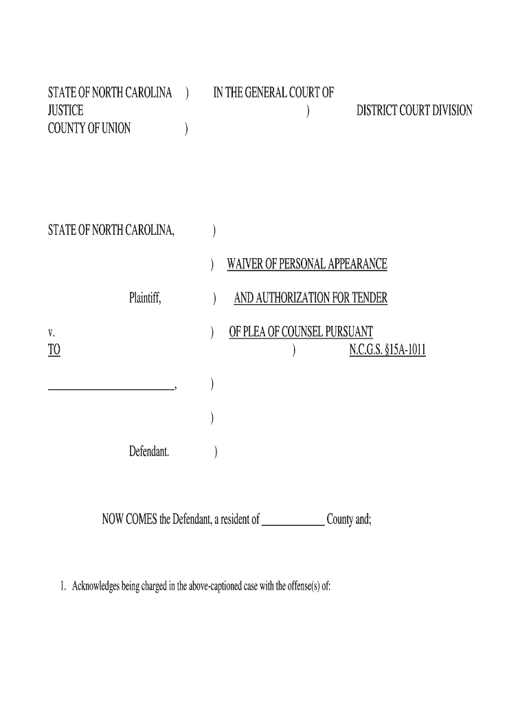 STATE OF NORTH CAROLINA JUSTICE COUNTY OF REINSTATE OF NORTH CAROLINA, Plaintiff, )IN THE GENERAL COURT OF)DISTRICT COURT DIVISION)))WAIVER OF PERSONAL APPEARANCE)AND AUTHORIZATION FOR Tender. TO),)OF