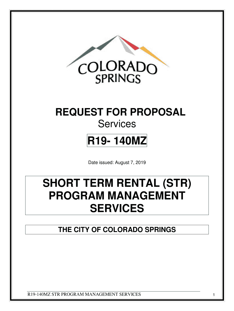 REQUEST FOR PROPOSAL ServicesR19 140MZ Date issued: August 7, 2019SHORT TERM RENTAL (STR) PROGRAM MANAGEMENT SERVICES THE CITY OF COLORADO SPRINGSR19140MZ STR PROGRAM MANAGEMENT SERVICES1The City