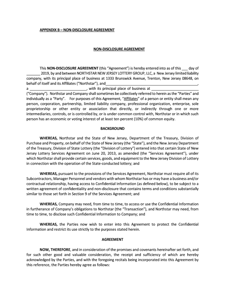 APPENDIX B NONDISCLOSURE AGREEMENTNONDISCLOSURE Agreements NONDISCLOSURE AGREEMENT (this Agreement) is hereby entered into as of this day of 2019, by and between NORTH STAR NEW JERSEY LOTTERY GROUP,