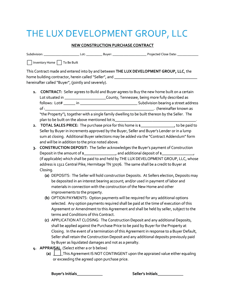THE LUX DEVELOPMENT GROUP, LLC NEW CONSTRUCTION PURCHASE CONTRACT Subdivision: Lot: Buyer: Projected Close Date: Inventory Home Be Bewitches Contract made and entered into by and between THE LUX DEVELOPMENT