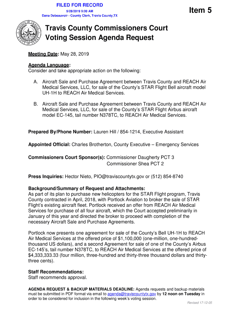 FILED FOR RECORD 5/28/2019 9:00 AM Dana Beauvoir County Clerk, Travis County, Item 5Travis County Commissioners Court Voting Session Agenda Request Meeting Date: May 28, 2019, Agenda Language: Consider