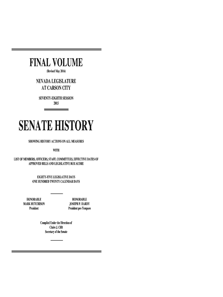 FINAL VOLUME (Revised May 2016)NEVADA LEGISLATURE AT CARSON CITY SEVENTYEIGHTH SESSION 2015SENATE HISTORY SHOWING HISTORY ACTIONS ON ALL MEASURES WITH LIST OF MEMBERS, OFFICERS, STAFF, COMMITTEES,