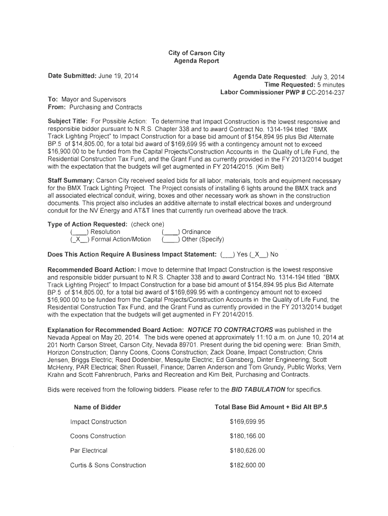 City of Carson City Agenda Report Date Submitted: June 19,2014Agenda Date Requested: July 3,2014, Time Requested: 5 minutes Labor Commissioner POP # CC2014237To: Mayor and Supervisors From: Purchasing