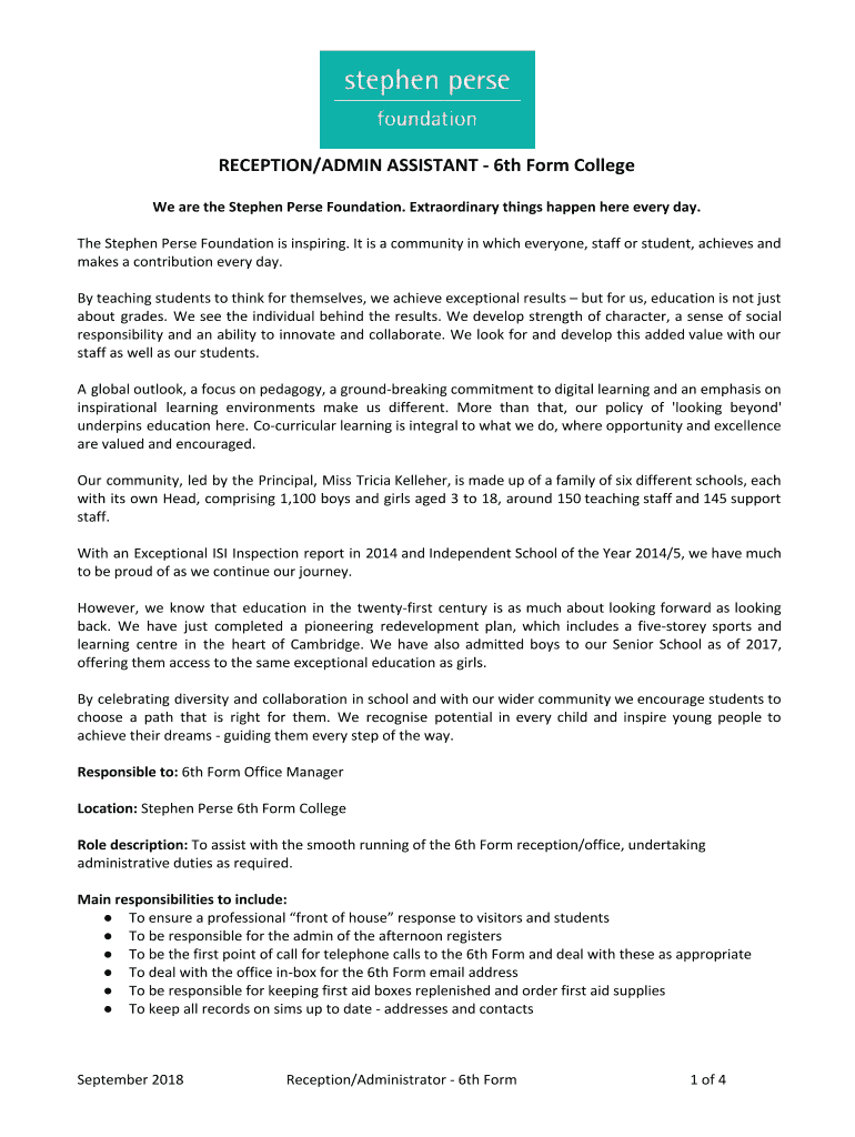 RECEPTION/ADMIN ASSISTANT 6th Form College We are the Stephen Verse Foundation. Extraordinary things happen here every day. The Stephen Verse Foundation is inspiring. It is a community in which everyone,