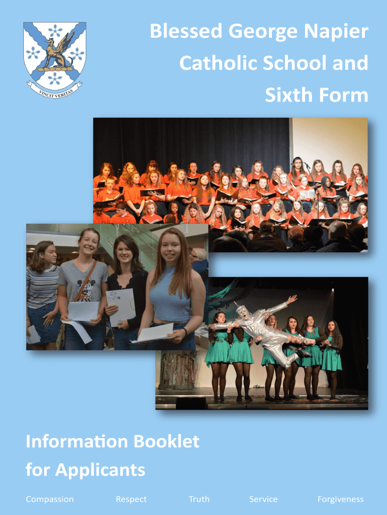 This document serves as an informational booklet for prospective applicants to the Blessed George Napier Catholic School, providing key facts, statistics, school ethos, mission statement, and safeguarding