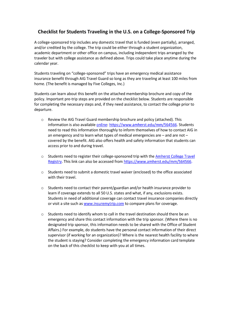 Checklist for Students Traveling in the U.S. on a CollegeSponsored Trip