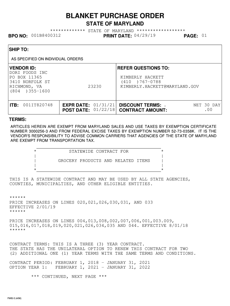 Get the free PDF version of FMIS BPO. Blanket Purchase Order number 001B8400312 - dgs maryland