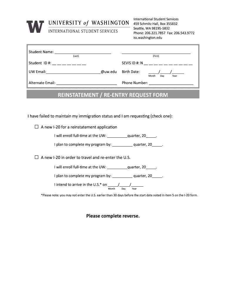 International Student Services 459 Schmitz Hall, Box 355832 Seattle, WA 981955832 Phone: 206.221.7857 Fax: 206.543.9772 ISS. Washington.student Name: (Last)(First)Student ID #: NEVIS ID #: N UW Email: