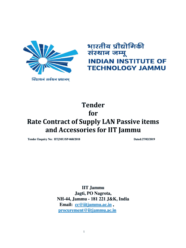 Tender for Rate Contract of Supply LAN Passive items and Accessories for IIT Jammy Tender Inquiry No: ITEMS/SP068/2018Dated:27/02/2019IIT Jammy Jagti, PO Nag rota, NH44, Jammy 181 221 J&K, India Email: